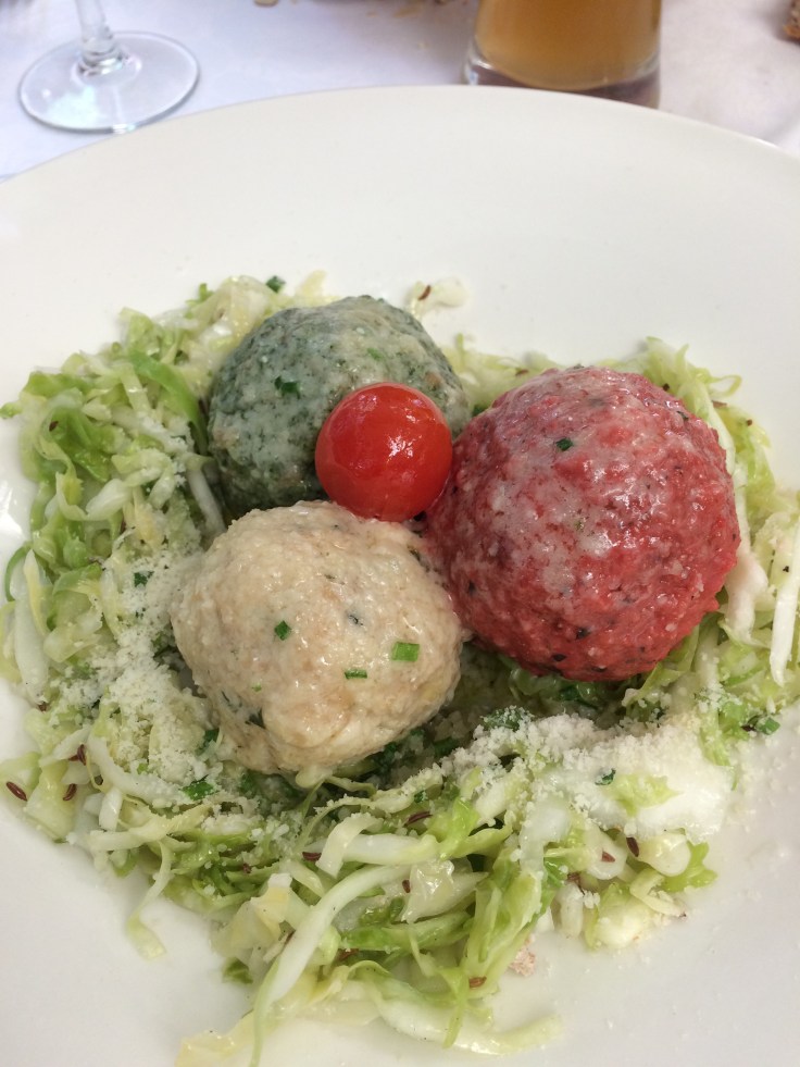 Pranzo alla Birreria Forst, proprio in centro, con un bel cortile all’aperto ma riparato, che offre una robusta cucina sudtirolese (non il massimo per i non carnivori, che si posssono rifare con dei gustosi canederli).